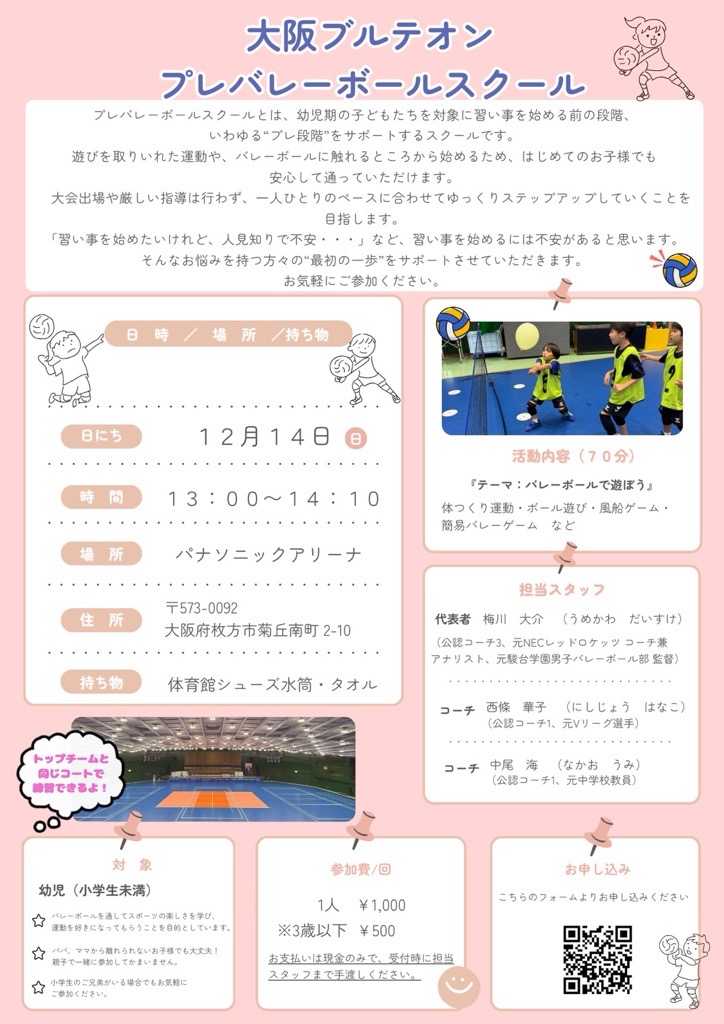 このたび大阪ブルテオンアカデミーでは、2025年12月14日(日)にパナソニックアリーナにて「プレバレーボールスクール」を開催することとなりましたので、お知らせいたします。