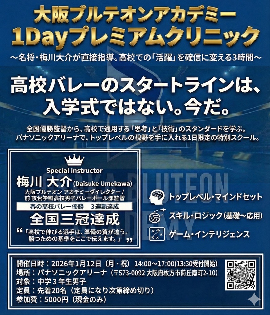 このたび大阪ブルテオンアカデミーでは、2026年1月12日(月・祝)にパナソニック アリーナにて「1Dayプレミアムクリニック」を開催することとなりましたので、お知らせいたします。