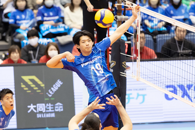 最後は富田が1枚ブロックで相手のスパイクをシャットアウトして25-23でセットを先取した。