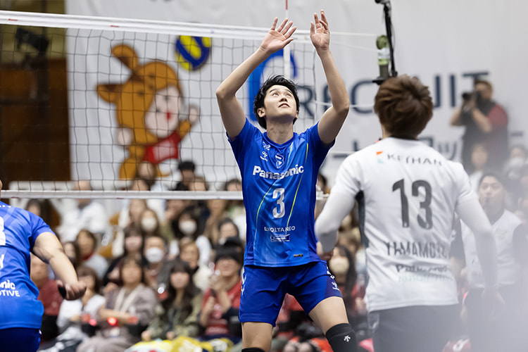 終盤も甲斐のディフェンスからのスパイクを中心に攻撃を展開、最後はラリーから西田が鋭いスパイクを決めて、25-18でセットを奪いストレートでの勝利を掴んだ。