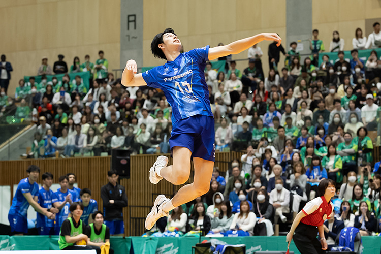 西山のスパイクでサイドアウトを取り、持ち味のディフェンスからリズムを立て直すもサービスエースを与えて8-12とされた。